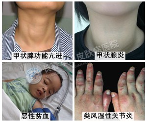 2.白癜风的并发症:白癜风少数患者可在其病程中伴发银屑病、斑秃,这三种疾病均被认为是自家免疫疾病。白癜风伴发各种自身免疫性疾病如:甲状腺功能亢进、甲状腺炎、糖尿病、恶性贫血、类风湿性关节炎等。头面部白癜风常伴随牙齿疾病,包括龋齿、义齿、牙畸形、异位、残根等。牙病与白癜风之间关系并不清楚。
