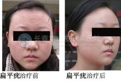 我在长春打工,去年发现脸上长了扁平疣,去药店买了些药,结果用药一个星期之后,发现脸比往常大了一倍,而且嘴角和眼角有些地方开始溃烂。于是,停止用药,在停药清洗后,浮肿渐渐消了,但是脸部有近40%的地方皮肤颜色变深,扁平疣并没有消除。
