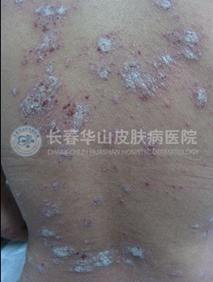 41岁的刘女士来我院治疗牛皮癣时,已有四年的病史。刘女士介绍,四年前,右上臂因被玻璃划破,造成感染,后伤口痊愈,但伤口处经常瘙痒发红,半月之后伤口周围出现红斑,红斑处干燥,逐步形成银白色皮屑,周围翘起,中部与皮肤相连,皮屑层层脱落,并慢慢向四周扩展,皮肤变硬,瘙痒难忍。病发一月后,去当地医院治疗,诊断为牛皮癣,用西药治疗,但毫无效果。癣块扩散到整个背部。