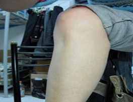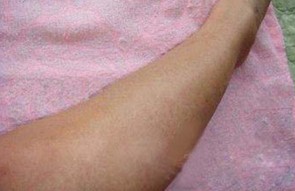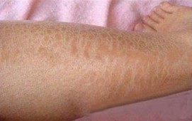 第一次复诊(7月18日):治疗重点仍是消除体内毒素。华山专家对王先生采用中药汉方制剂进行汽化熏蒸,疏通微小血管,改善微循环。除了消除毒素外,还进行疏通微小血管,改善微循环的治疗,以达到综合治疗的目的。经过先前治疗,约30%左右鳞屑脱落,皮肤触感不僵硬。