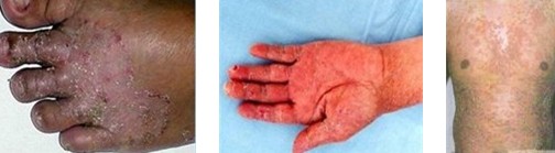 手足癣多伴有剧痒,损害初期常有散在小水泡发生,尔后以脱屑为主,皮纹加深、触之粗糙,病久者呈现角化增厚,手癣初起时常始于掌心,而足癣多起于趾掌部位,久之累及整个表面。皮损延及手背、手腕处呈体癣症状,指尖浸润糜烂病变好发于第三、四指间,多为白念珠菌所致。